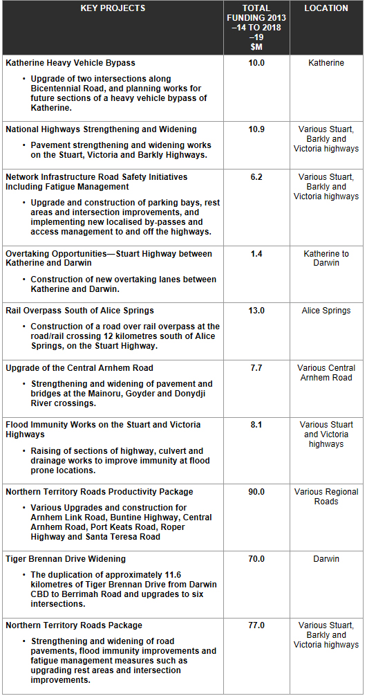 The funds for the Northern Territory are part of the Government's $50 billion infrastructure plan in the 2014–15 Budget.